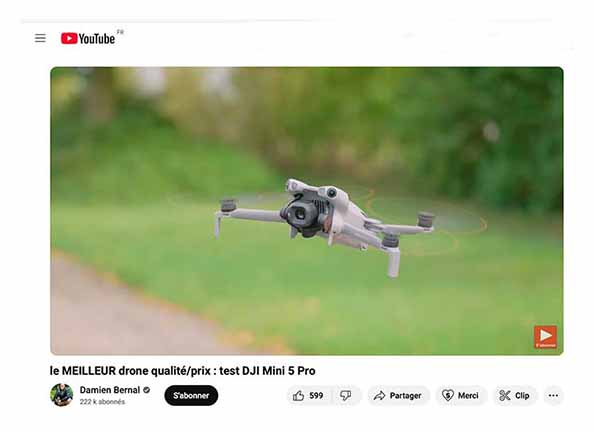 Visionnez le test du DJI Mini 5 Pro sur la chaîne YouTube de Damien Bernal.