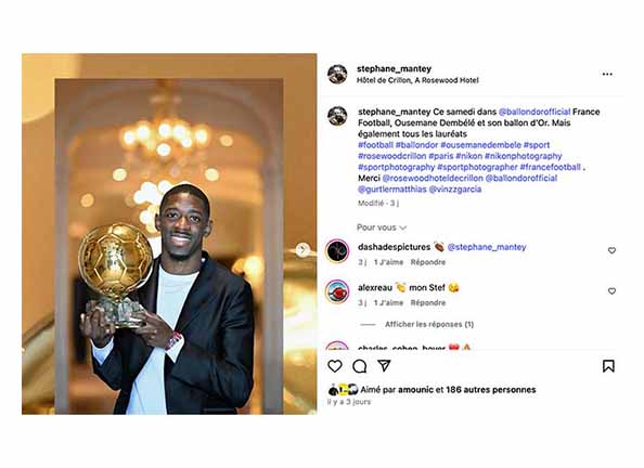 Découvrez le compte Instagram du photographe Stéphane Mantey qui a réalisé la photo d’Ousmane Dembélé, le lendemain de la cérémonie du Ballon d’or.