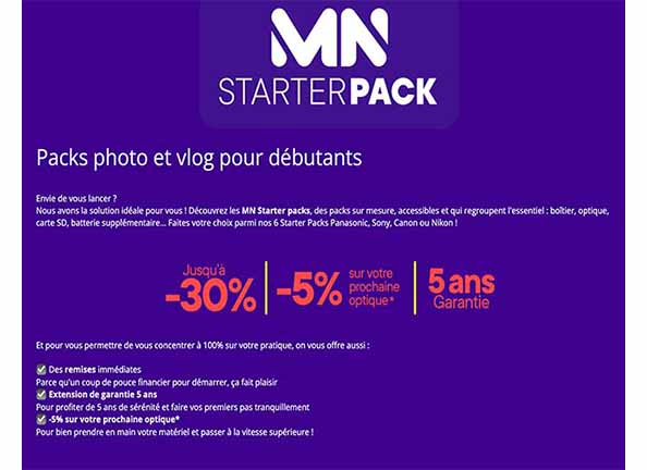 Les starterpack ce sont des packs sur mesure (boîtier+optique+ carte mémoire+batterie) pour s’équiper en hybride ou le vlog à prix « découverte ». Découvrez-les