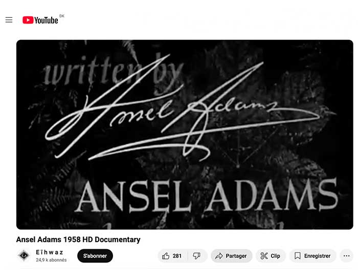 Dans ce documentaire datant de 1958 (en anglais) découvrez l’approche technique et artistique de cet illustre photographe considéré comme un des pères de la photographie de paysage.